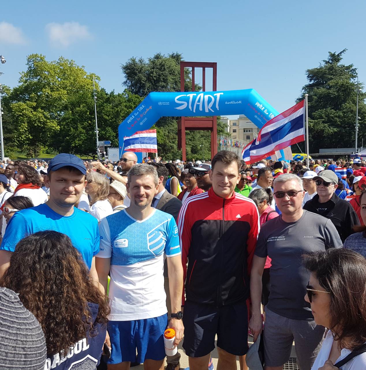 Представители Беларуси одними из первых пересекли финишную линию. В забеге приняли участие министр здравоохранения Валерий Малашко, Постоянный представитель нашей страны при Отделении ООН и других международных организациях в Женеве Юрий Амбразевич, советник Постоянного представительства Владимир Богомаз, начальник отдела внешних связей Минздрава Анатолий Грушковский, заместитель гендиректора республиканского УП «Управляющая компания холдинга «Белфармпром» Виктор Шеин и другие.